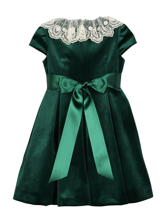 Luli & Me Girls Luxe Velvet Holiday Dress - Lace Collar - Ribbon Sash - Green
