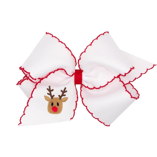 Wee Ones Girls White Hair Bow - Red Moonstitch - Embroidered Rudolph Reindeer