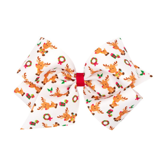 Wee Ones Girls Grosgrain Holiday Print Hair Bow - White with Reindeer