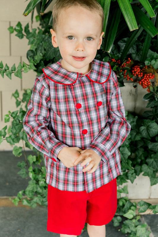 Bailey Boys Red Corduroy Shortall with Tabs & Winter Holiday Plaid Shirt