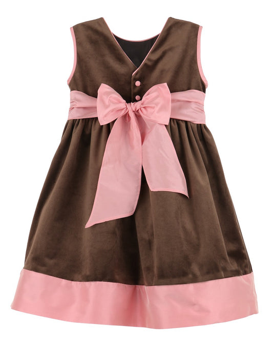 Luli & Me Girls Sleeveless Velvet Dress - Cocoa Brown - Pink Trim & Sash