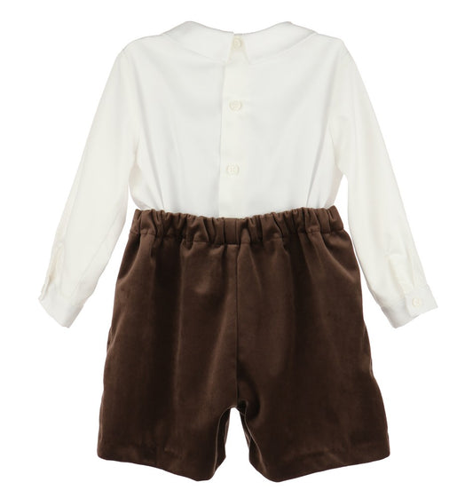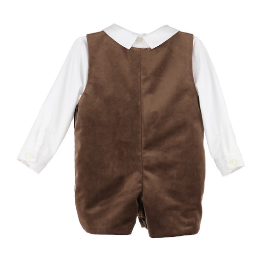 Luli & Me Boys Dressy Velvet Shortall with Shirt - Cocoa Brown