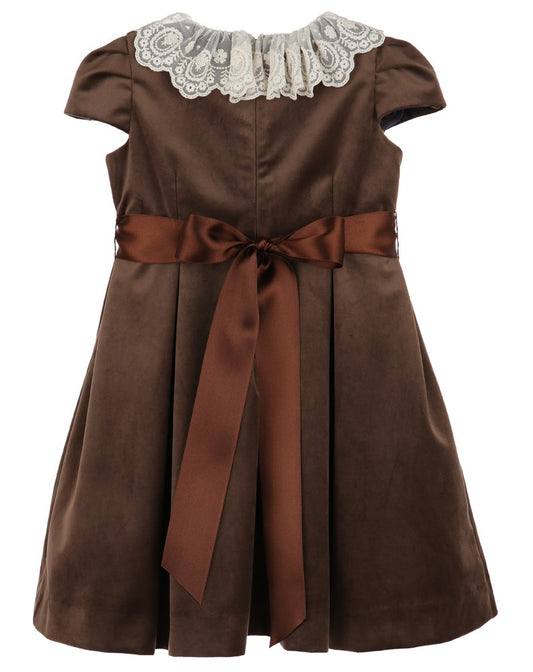 Luli & Me Girls Deluxe Velvet Dress - Lace Collar - Ribbon Sash - Chocolate Brown