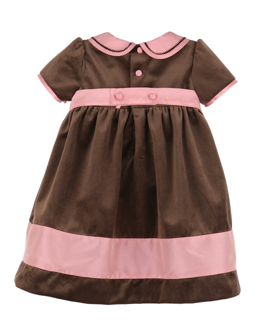 Luli & Me Girls Velvet Dress - Cocoa Brown - Pink Collar & Trim