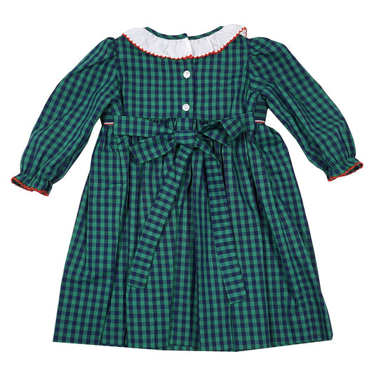 Petit Bebe Girls Green Holiday Plaid Smocked Santa Dress - Long Sleeves