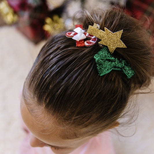 Sweet Wink Girls Hair Clip Set of 3 - Christmas Candy Cane / Green Bow / Gold Star