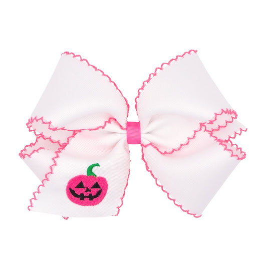Wee Ones Girls Hair Bow on Clip - Embroidered Pink Halloween Jack O'Lantern on White