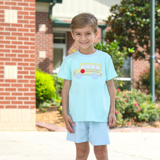 Trotter Street Kids Boys Aqua / Blue Yellow School Bus Shorts Set