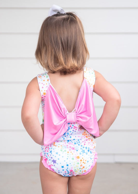 James & Lottie Girls Lottie Swimsuit - Colorful Stars - Pink Bow on Back