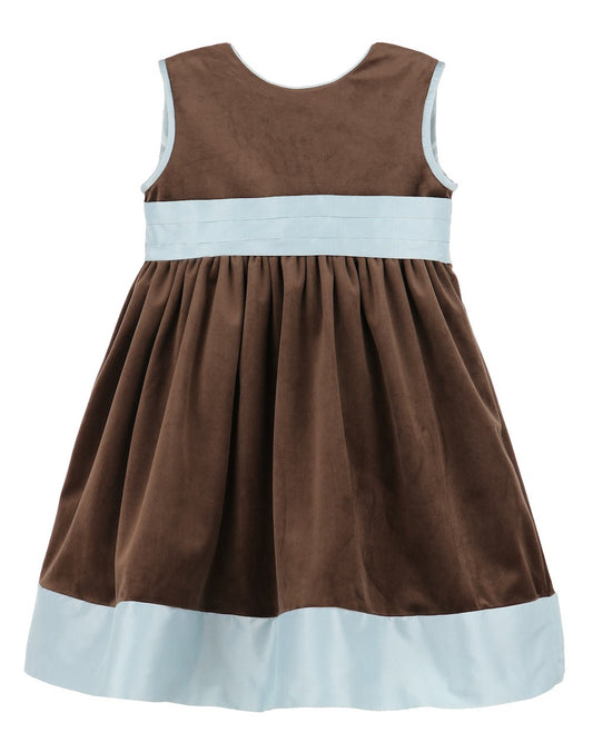 Luli & Me Girls Sleeveless Velvet Dress - Cocoa Brown - Blue Trim & Sash