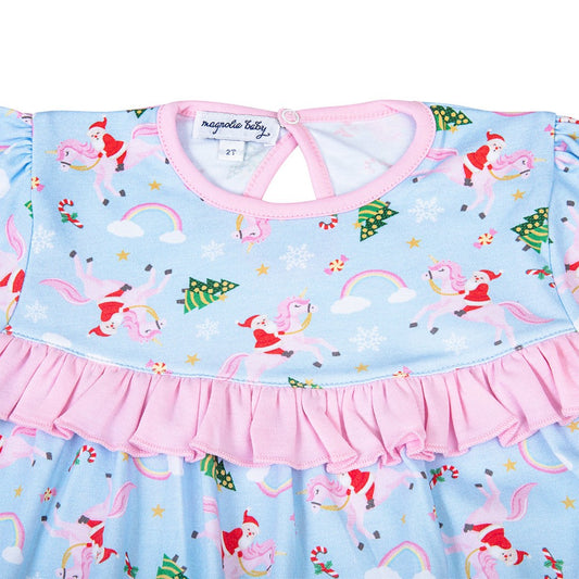Magnolia Baby Girls Blue Merry Christmas Unicorn Ruffle Dress