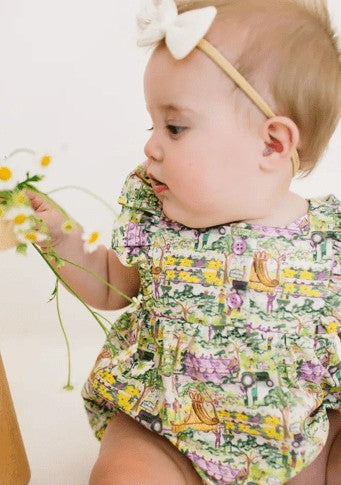 Ollie Jay Baby Girls Betsy Romper Bubble in Mardi Gras Print