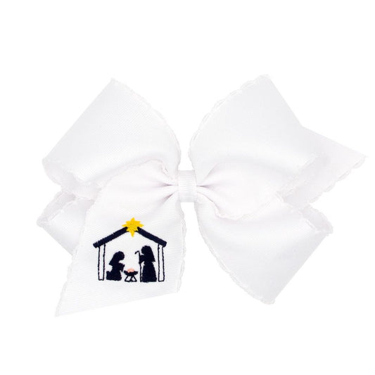 Wee Ones Girls White Moonstitch Hair Bow - Embroidered Nativity - Dark Blue