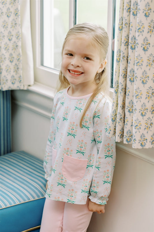 Proper Peony Pima Girls Pink Leggings with Blue Floral Margot Tunic Top