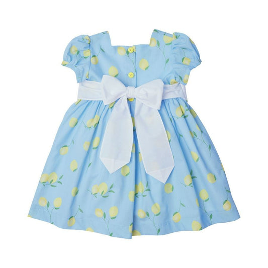Sal & Pimenta Girls Dress - Sash - Blue with Yellow Lemons Embroidery