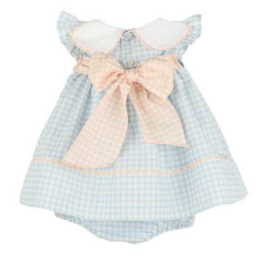 Sophie & Lucas Girls Classic Petal Collar Float Dress - Blue Bow on Back - Peach Gingham