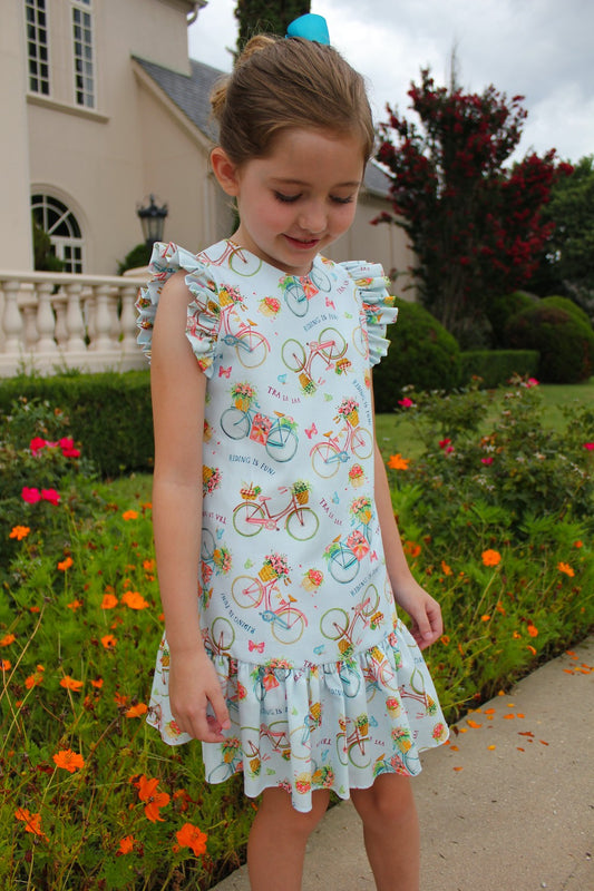 Susanne Lively Girls Blue Country French Bicycle Print Dress - Drop Waist