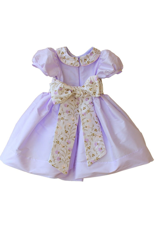 Susanne Lively Girls Puff Sleeve Dress with Embroidery Collar & Sash - Lilac Lavender