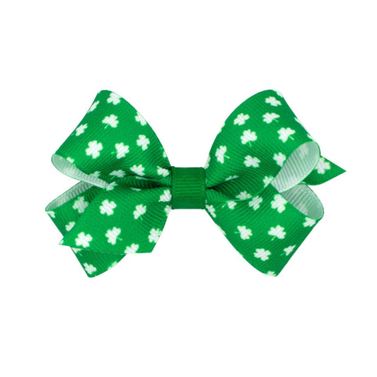Wee Ones Girls Hair Bow on Clip - Tiny White Shamrocks on Green Bow
