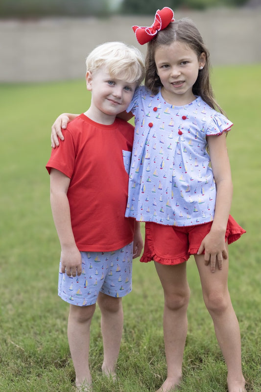 Whimsy Bay Kids Toddler Girls Blue Sailing Away Flutter Top with Red Shorts