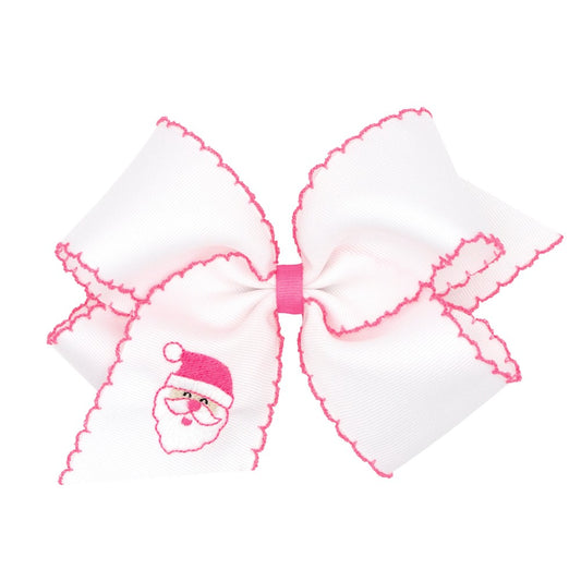 Wee Ones Girls Hair Bow - Pink Moonstitch - Embroidered Santa Face on White Bow