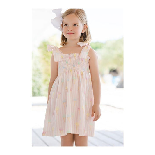 Sal & Pimenta Girls Pink Ice Creams Smocked Sun Dress - Ties at Shoulders